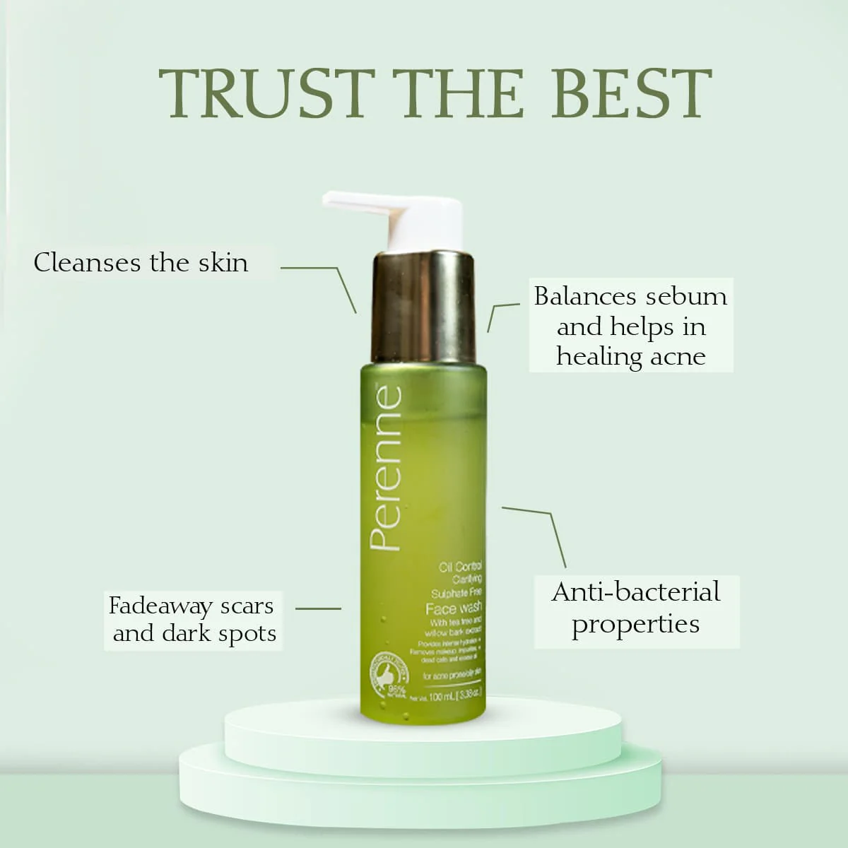 Perenne oil-free clarifying Face wash (100 ml) is a soap-based gentle face wash for sensitive and acne-prone skin. It deeply cleanses the skin and removes dirt and excess oil from the pores. It leaves skin soft, supple and hydrated and has a soothing effect. It has tea tree oil and willow bark extracts which clears up blemishes without irritation and helps maintain a flawless skin preventing acne. Glycolic acid gently exfoliates the skin revealing a brighter and more radiant complexion.